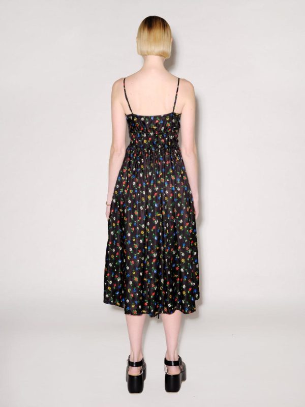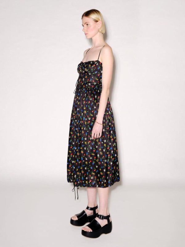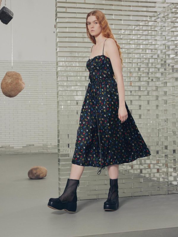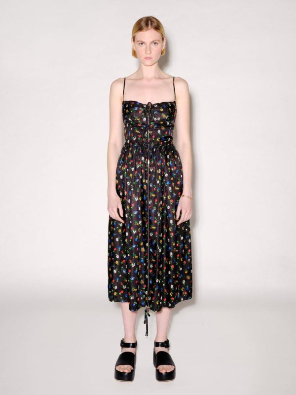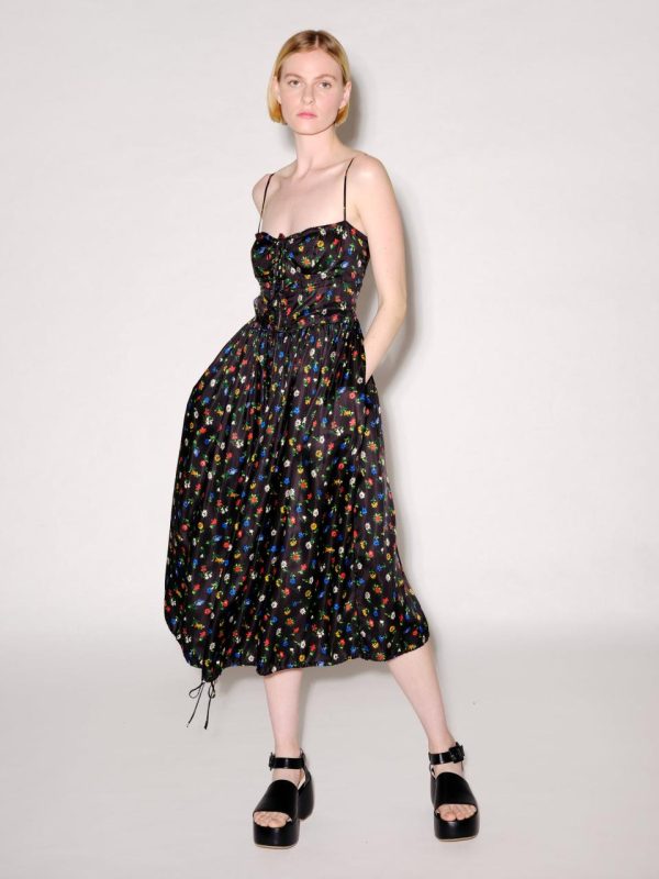 Designed with a floral pattern, Rosetta Getty’s Fluid Satin is soft, light, and cool to the touch. An ideal fabric for transitioning from day to evening wear, the smooth characteristic of the material spotlights in gathered detailing.