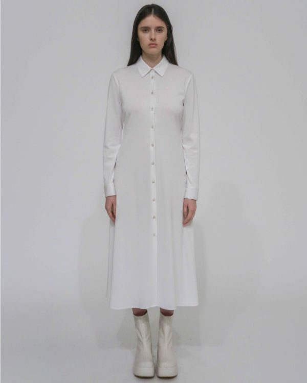 Reimagining the archetypal shirtdress, Fall 24’s version is tailored to a fit & flare silhouette. Cut in the heavier-weight Icy Cotton Rib Jersey, the style has soft structure and a polished finish to complement its refined and minimalist look.