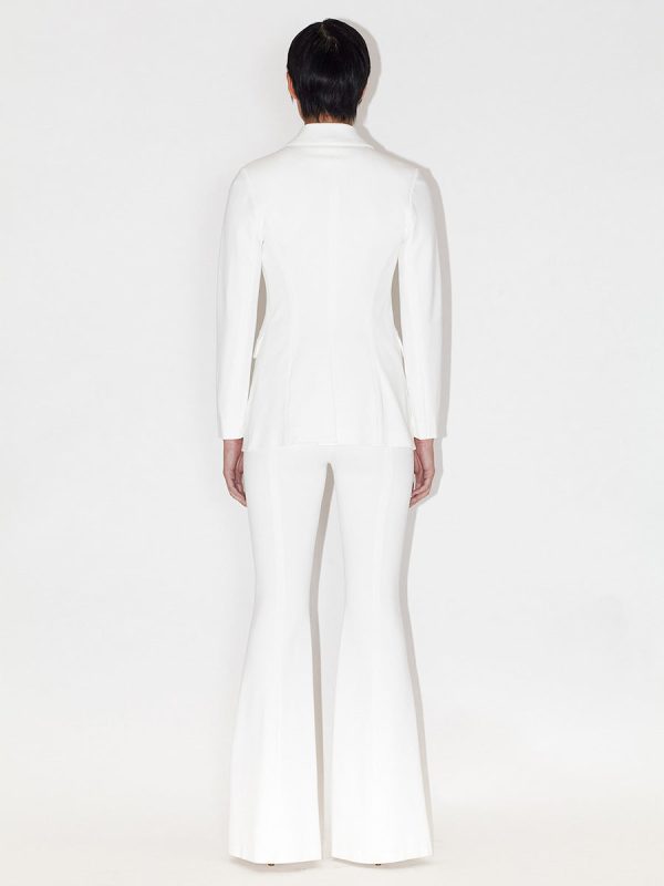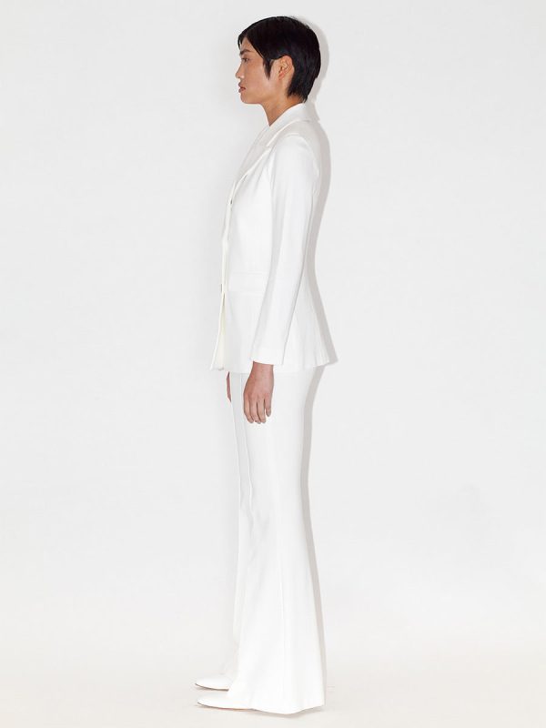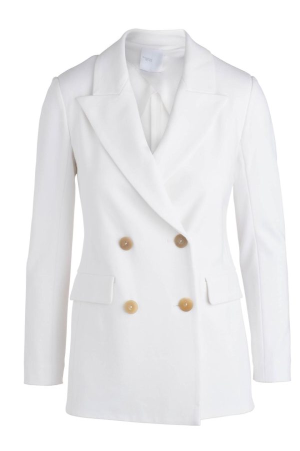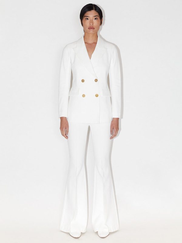 Our signature double-breasted peak lapel jacket, crafted from a luxurious, lightweight white interlock jersey.