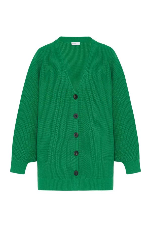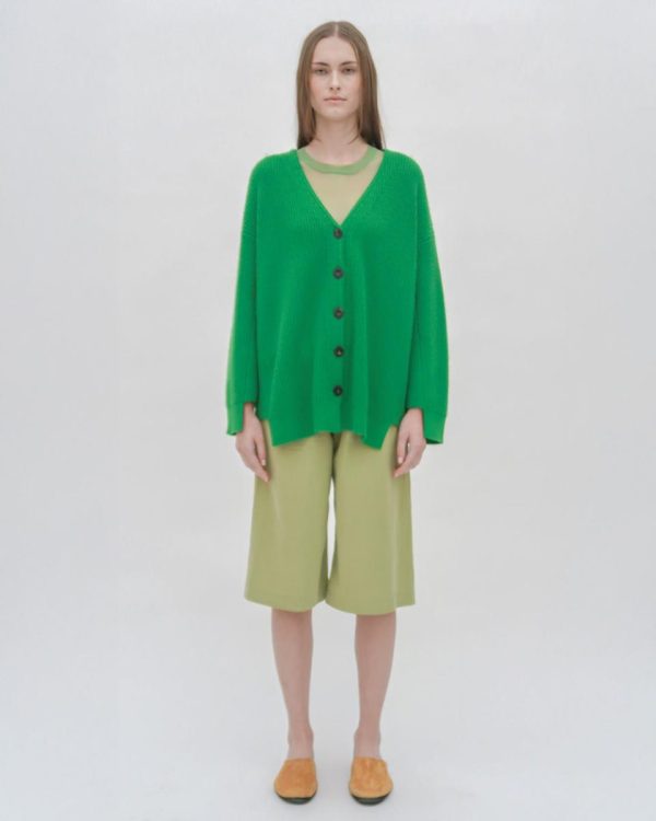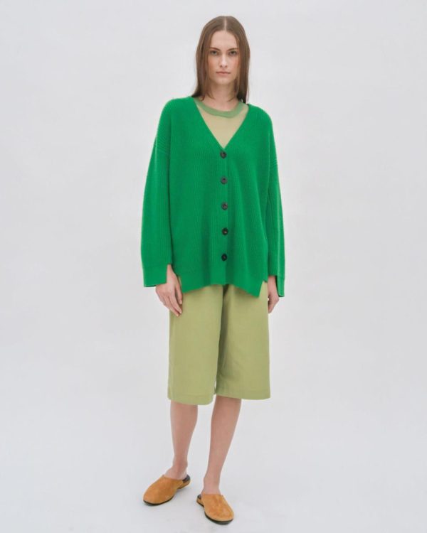 Knit of soft Mercerized Wool Cashmere, this staple cardigan silhouette is designed with an oversized fit and directional ribbing for structure and shape. Wing sleeves lend interest to the style, which features tonal buttons for a refined finish.