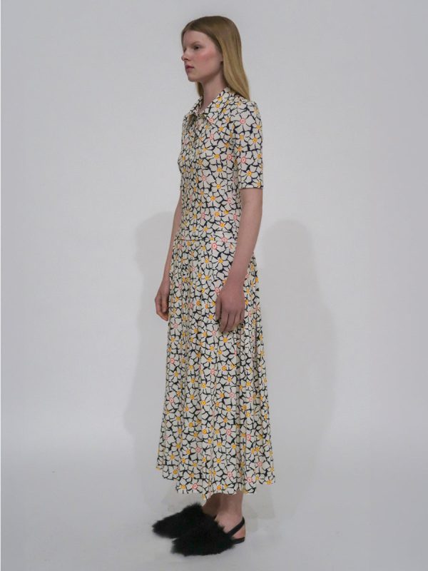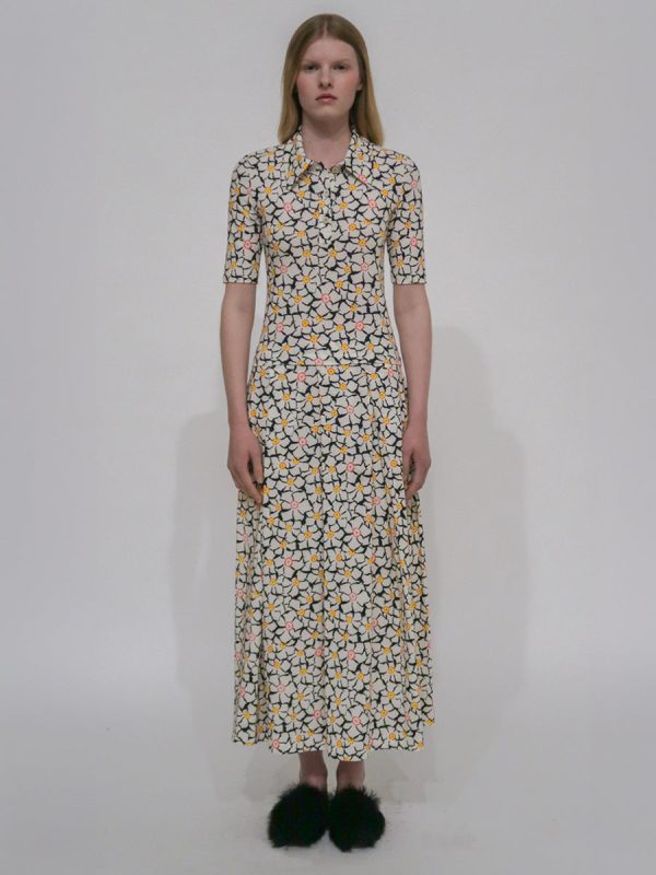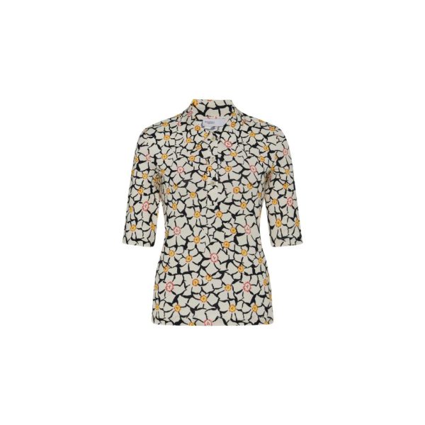 The Polo T-Shirt is crafted of stretch cotton jersey with the season’s Geometric Florals pattern: a unique block print of a daisy. It is cut to be fitted through the bodice with a polo neckline and slim elbow-length sleeves.