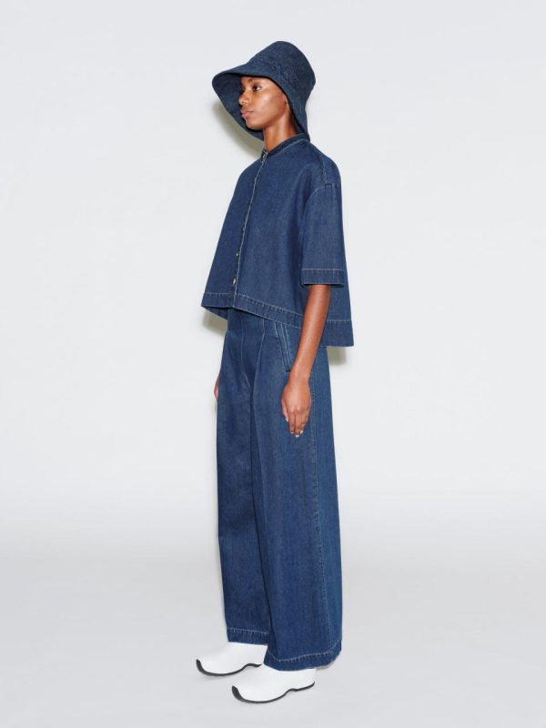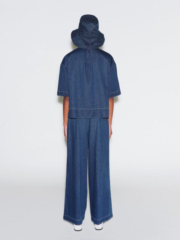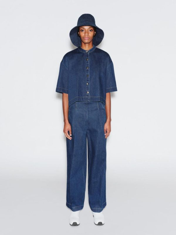 Rethinking the archetypal staple of a denim shirt, for Spring 24 Rosetta Getty presents a boxy, cropped silhouette in the brand’s new mid-weight denim. A timeless indigo blue hue has a classic feel, while soft drape and a collarless neckline modernize the enduring style.