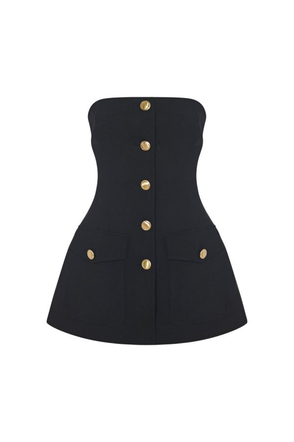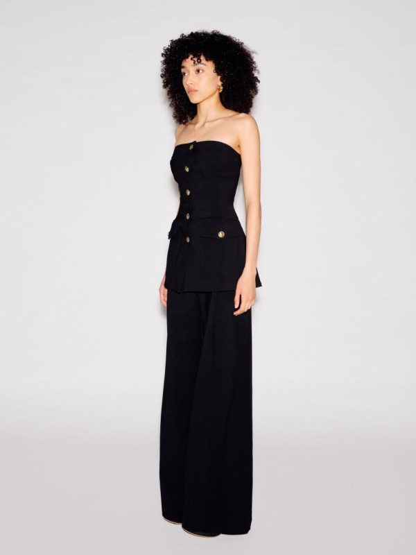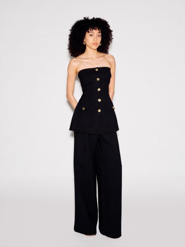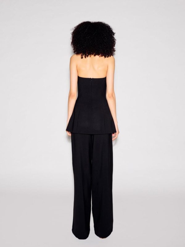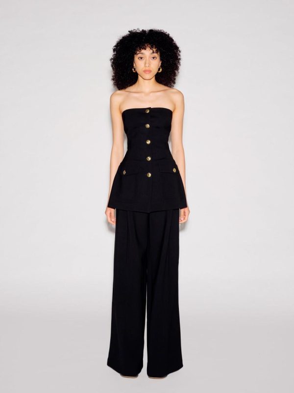 Offering a new and unexpected silhouette to augment existing pieces in the Stretch Wool Scuba Suiting capsule, this strapless top is sophisticated and modern. Featuring signature gold buttons, it has a feminine peplum hem offset by utilitarian front cargo pockets – the perfect companion for Fall 23’s Button Pleat Pant.